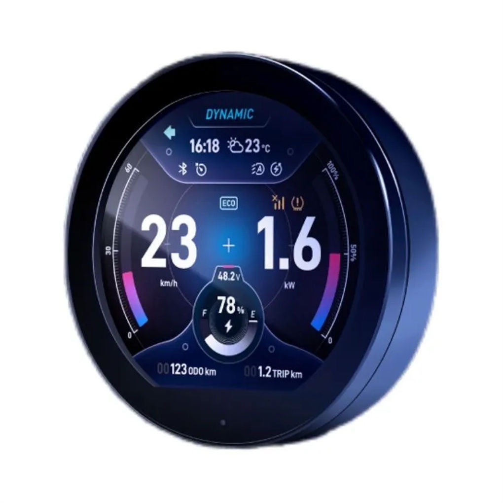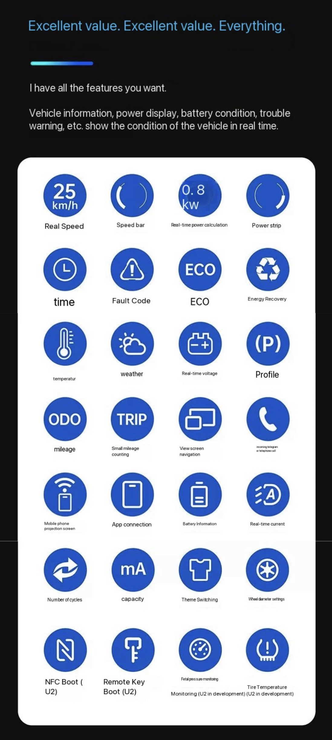 You have all the features you want like: Vehicle information, power display, battery condition, trouble warning, show the condition of the vehicle in real time, Real Speed, Speed bar, Real-time power calculation, Power strip, ECO, Time, Fault Code, Energy Recovery, Temperature, Weather, Real-time voltage, Profile, ODO, TRIP mileage counting, Small mileage navigation, View screen Mobile phone projection screen, App connection, Battery Information, Real-time current, Number of cycles capacity, Theme Switching, Wheel diameter settings, NFC Boot, Pressure monitor, Tire Temperature and many more.